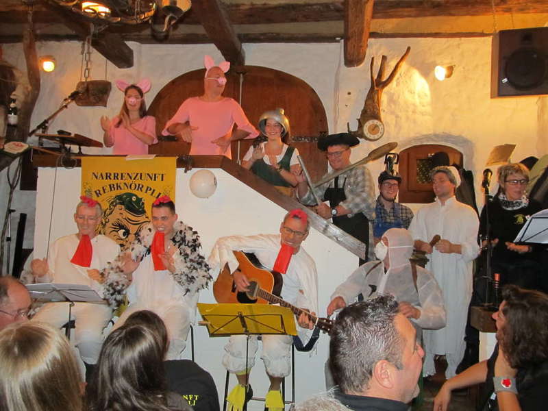 Der Narrenkeller platzte aus allen Nähten, als die Rebknörpli-Zunft um Zunftmeister Uli Litterst zu ihrem »Gmiedliche Obe« wieder viele Gäste »ussem Rebland« begrüßen konnte. Selbst die Zellwiller wollten zum 11.11. kommen, aber da mussten die Fessenbacher diesmal passen. Doch zumindest war eine »Videoschaltung« garantiert. So lernten die Zellwiller das Rebknöpli-Lied kennen, das natürlich aus vollen Narrenkehlen gesungen wurde. Denn eines haben die Franzosen gar nicht verstanden, dass das Fessenbach-Lied bei der 775-Jahr-Feier nicht lebhaft mitgesungen wurde.