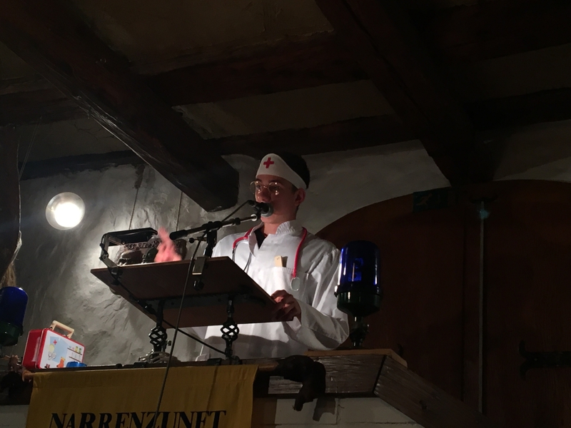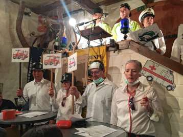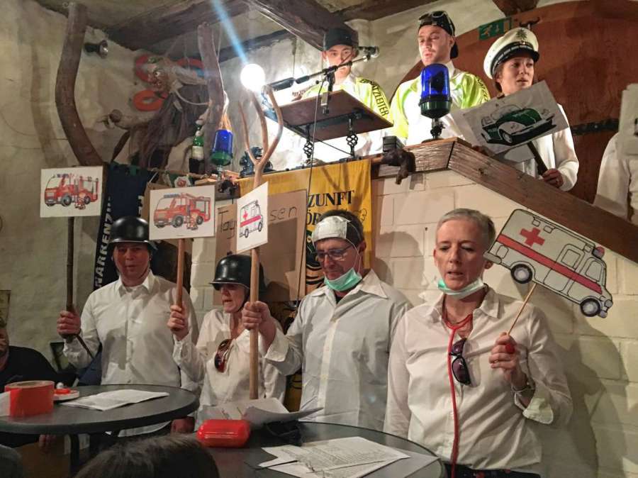 Nachdem die herzhafte Sprechstunde des Doktor Klingelberger vorbei war, kam das große »Tatütata« mit den Bänklisängern angebraust. Bei einer spontanen Übung war dann die Einsatzzentrale im Narrenkeller angesagt und da war die Polizei ebenso zugegen wie die Bergwacht, das Rote Kreuz, die Feuerwehr und wie immer gekonnt trugen die Bänklisänger ihre Hymnen musikalisch begleitet von Markus Litterst vor.