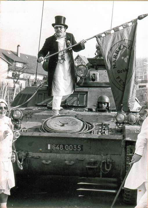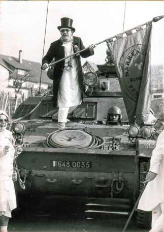Die Fessenbacher Rebknörpli zogen aber dann unverrichteter Dinge weiter vors Fessenbacher Rathaus, wo sie wahrscheinlich weniger kriegerisch empfangen wurden. Doch dieser denkwürdige Schmutzige Donnerstag 1981 ist in den Annalen der Rebknörpli fest verankert, fand doch tatsächlich an diesem Tag nicht nur eine Besetzung des Rathauses statt, sondern auch die Stürmung und Besetzung eines französischen Panzers.