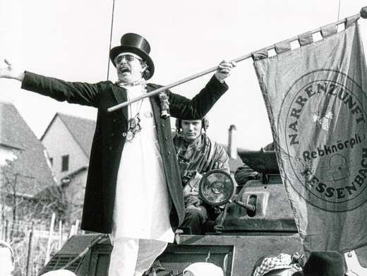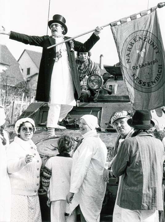 Just also am Schmutzigen Donnerstag, dem 26. Februar 1981, fuhr ein französischer Panzer die Fessenbacher Weinbergstraße hinunter, als sich die Rebknörpli vor dem Gasthaus »Linde« versammelten. Gerade erst fand um 6 Uhr in der Frühe die Zeremonie mit der Fasnachtsdaifi statt, und traditionell ist dann danach die Dorfbegehung. So versammelten sich die Rebknörpli vor der »Linde« zum Rathaussturm, wie sich Uli Litterst, Ehrenzunftmeister der Rebknörpli, erinnert.