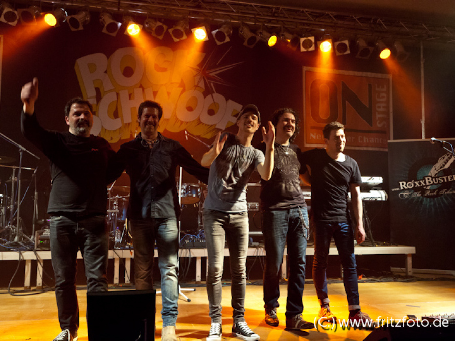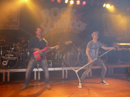 "Owner of a lonely heart" von Yes, ja wann hatten wir diesen Song jemals von einer Coverband gehört? Und dann noch so! Die Leute flippten aus. Die Band: perfekt eingespielt! Frontmann Hagen Grohe und Bandchef Frank Rohles sind wahre Stimmwunder, aber auch die anderen haben's gesanglich drauf! Drummer Ralph Winter jodelte "Love is like oxygen" wie Sweets Brian Connolly in seinen besten Tagen, der Chor mehrstimmig, die Hände oben. Da waren die Fans bereits elektrisiert. Die eingefleischten Starkstromrocker im Publikum verziehen sogar Aha's "Take on me", und bis sie begriffen was da läuft, ging's fließend über in "A kind of magic", wo Frank Rohles die queentypische Gitarre effektvoll in Szene setzte und mit schönen Brian May Einlagen glänzte. Die Rockjünger waren da schon nicht mehr aufzuhalten. Tausend Hände oben und alle sangen "Hey-oh" im Dauerchor. Sehr stimmungsvoll auch "Who wants to live forever" mit einem fetten Keyboard-Schlagzeug-Intro. Überhaupt, die Queen-Songs, sie sind ein echtes Markenzeichen von RoxxBusters, mit gesanglichen Höhepunkten und originalgetreuen Gitarrensoli von "Brian" Rohles. Genial.