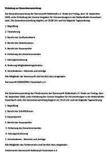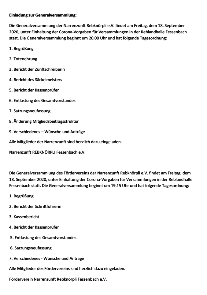 Wir laden Sie herzlich ein zur Generalversammlung der Narrenzunft Rebknörpli e.V. am Freitag, 18. September 2020. Sie findet unter Einhaltung der Corona-Vorgaben für Versammlungen in der Reblandhalle Fessenbach statt. Beginn 20.00 Uhr.