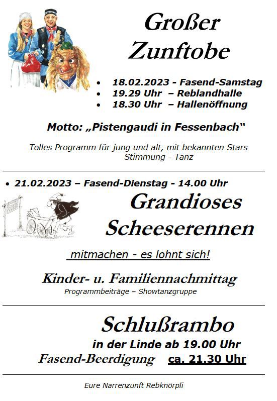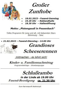 Höhepunkt jeder Kampagne ist der traditionelle Zunftobe am Fasend-Samschdig, aber auch mit unserer Fasentdaifi, dem Gizig Riefe im Dorf, Scheeserennen, Kindernachmittag und Schlussrambo mit Fasendbeerdigung bieten wir stets ein grandioses Programm - und...unser Rockschwoof ist Kult!!!